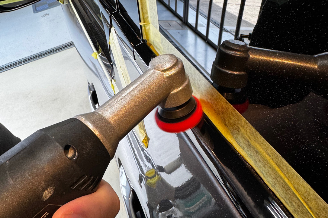 窓枠のピアノブラックパーツは小傷が確認できたため、ミニポリッシャーを使用して除去します。