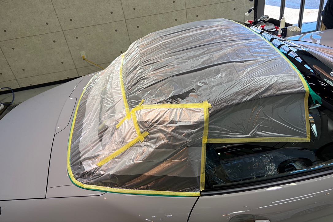 ソフトトップ(幌)に研磨時に出る粉が入らないよう、しっかり養生して作業します。