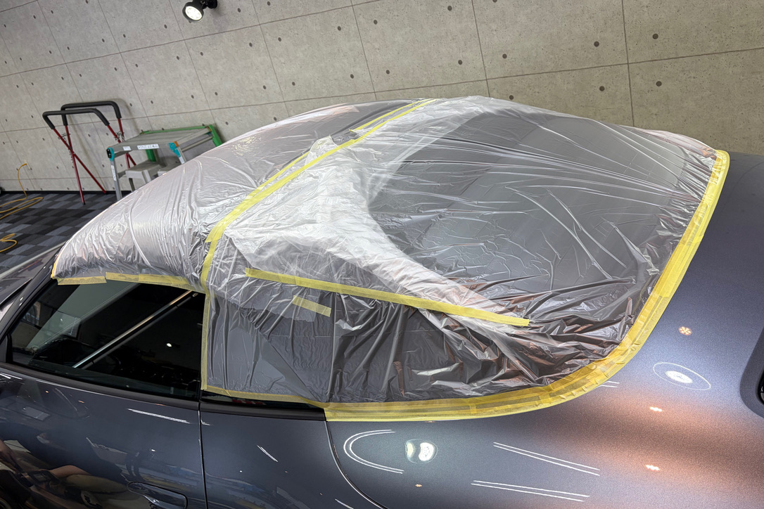 幌に、研磨時の粉が入らないようしっかり養生して作業します。