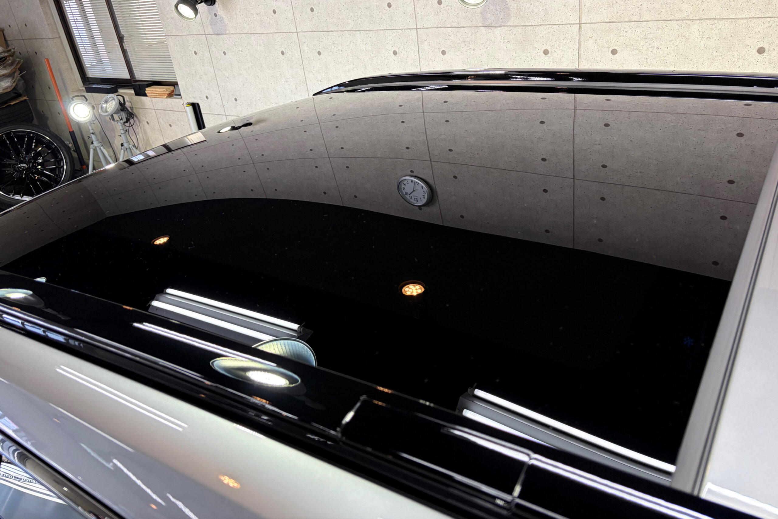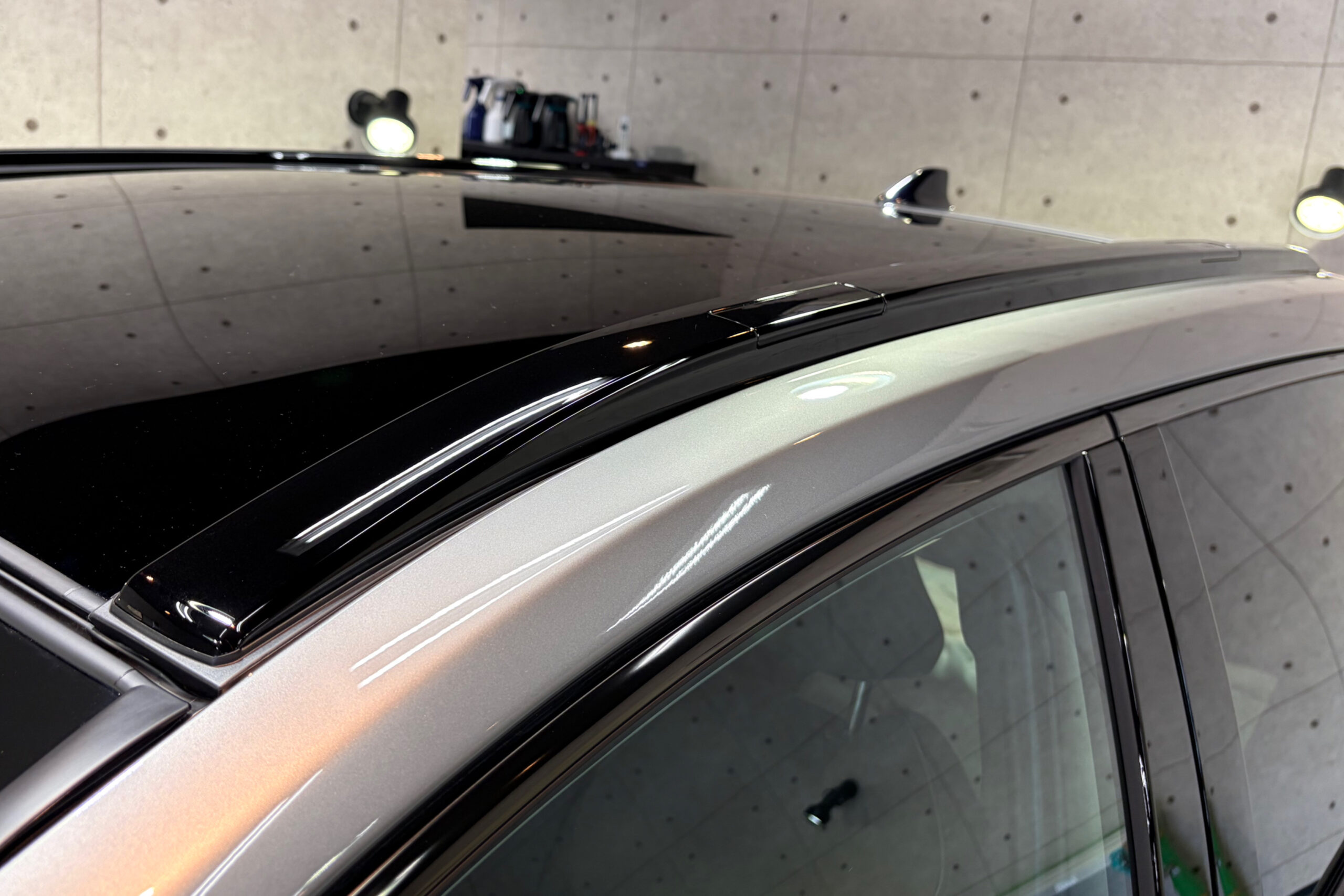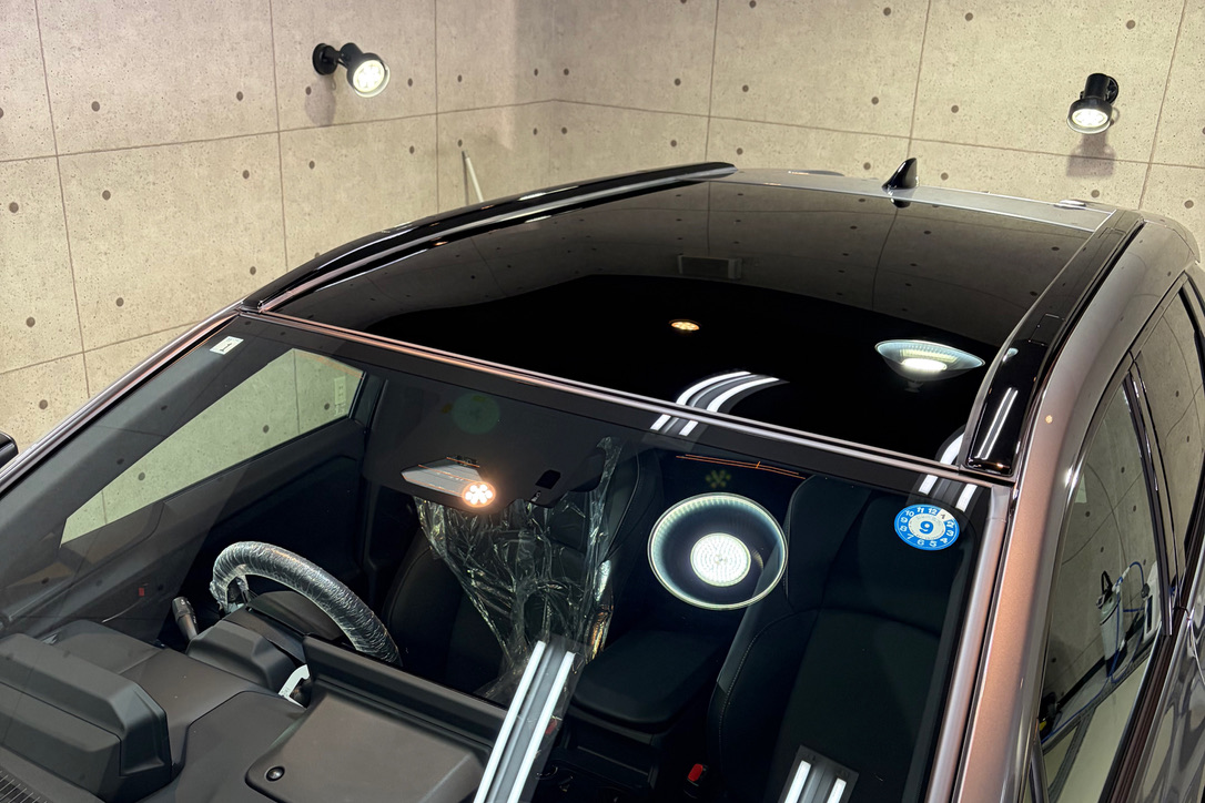 ガラスルーフの雨染みも除去してから窓ガラス用のコーティングをおこないます。