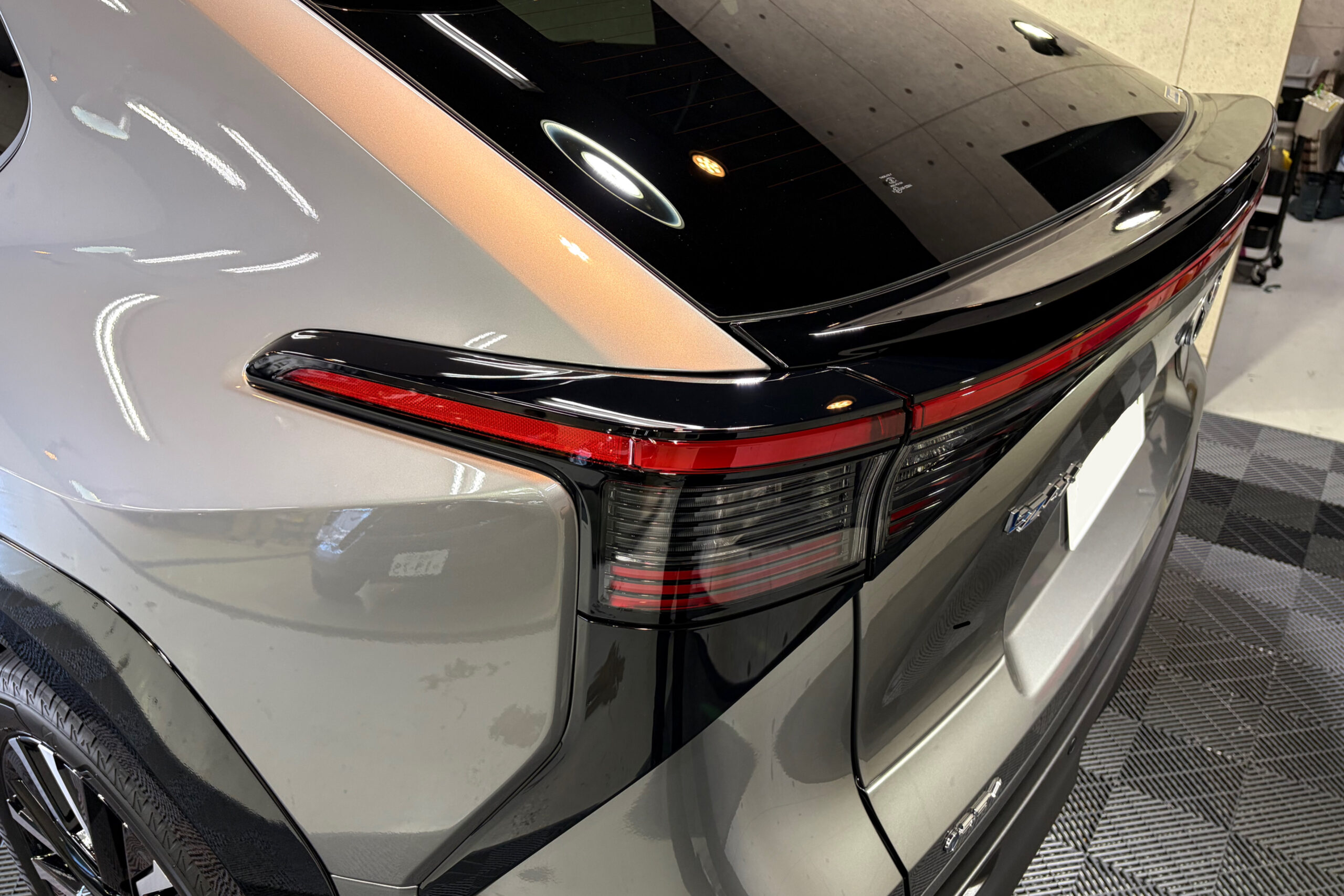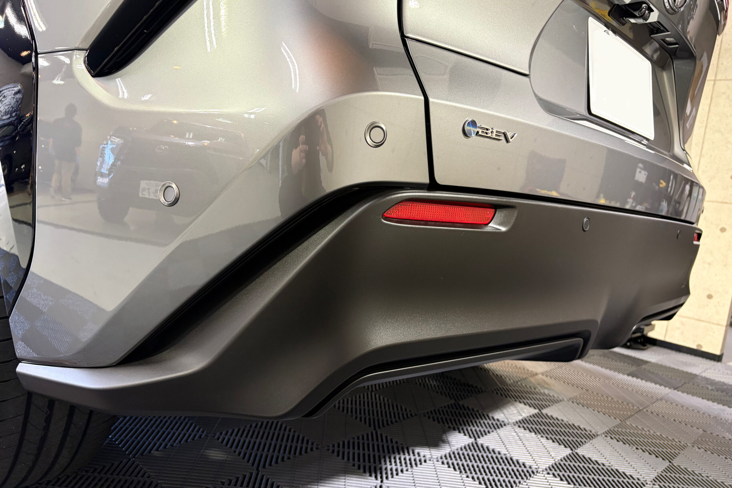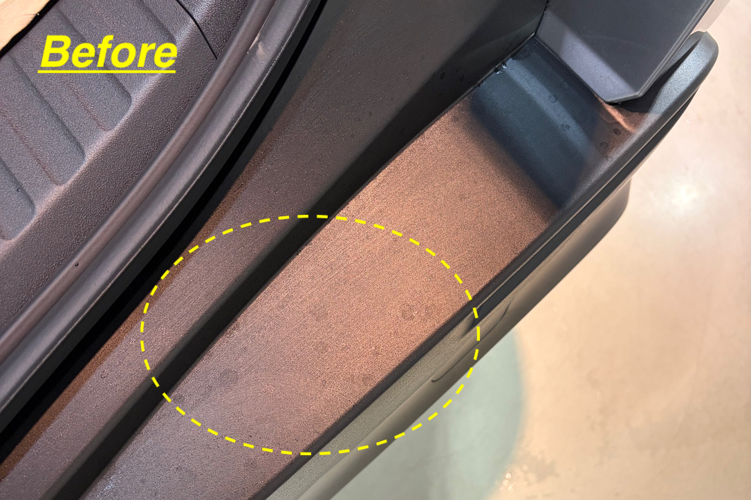 バックドアを開けた未塗装樹脂のリヤバンパー上部には雨染みが付着していました。
