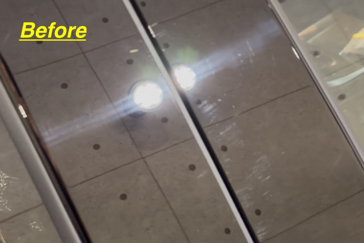 専用ケミカルで除去できる雨染み(イオンデポジット)はクリーニング工程で除去します。
