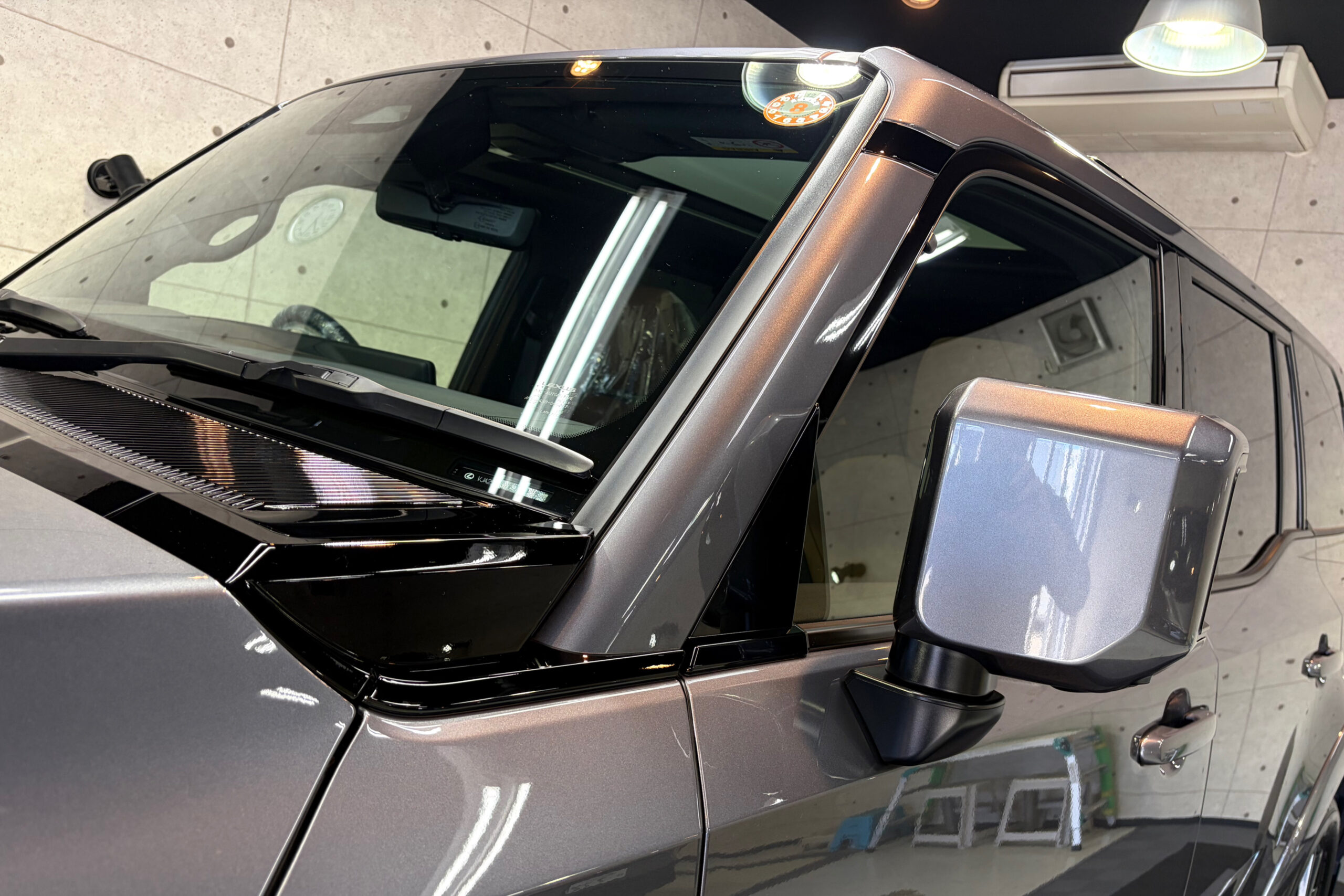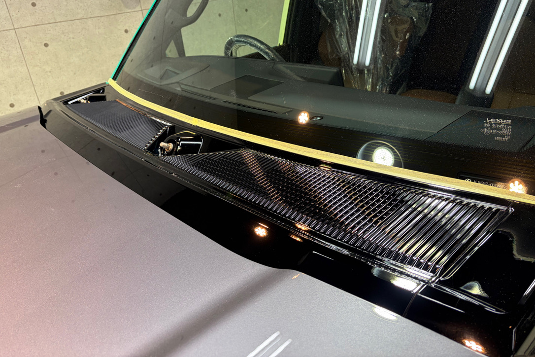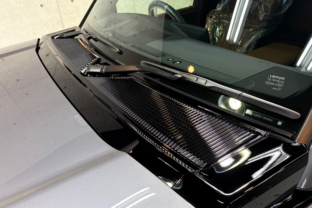 レクサス・GXのカウルトップ(フロントワイパー部)は、グロスブラックパーツになります。
