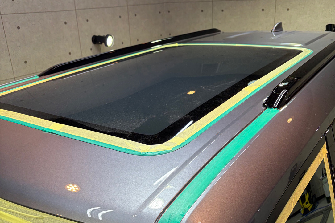 そのため、低粘着力のマスキング(緑色)を使用して、負担をかけないように気を配りながら施工しています。